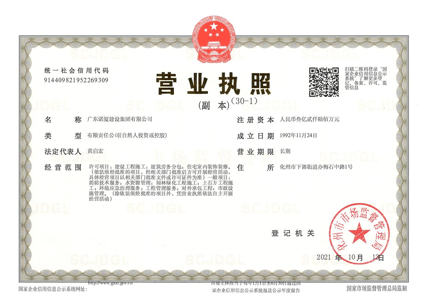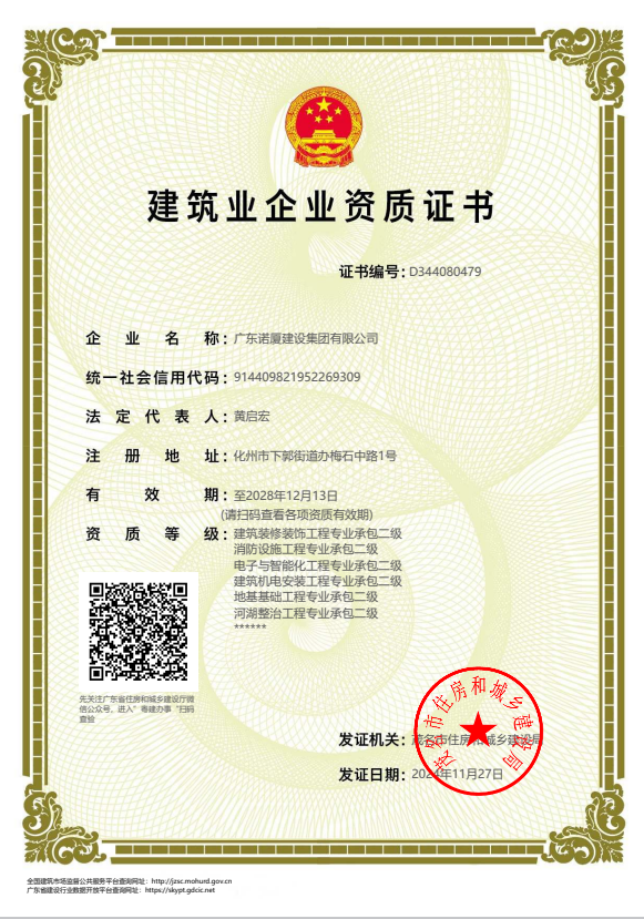 廣東諾廈建設(shè)集團(tuán)有限公司是諾廈集團(tuán)的核心企業(yè),具備國家房屋建筑工程施工總承包壹級、市政工程施工總承包壹級、港口與航道工程總承包、建筑裝修裝飾工程、消防設(shè)施工程、地基基礎(chǔ)工程、機電設(shè)備安裝工程、體育場地設(shè)施工程、建筑智能化工程、河湖整治工程、水利水電工程等資質(zhì)。......
